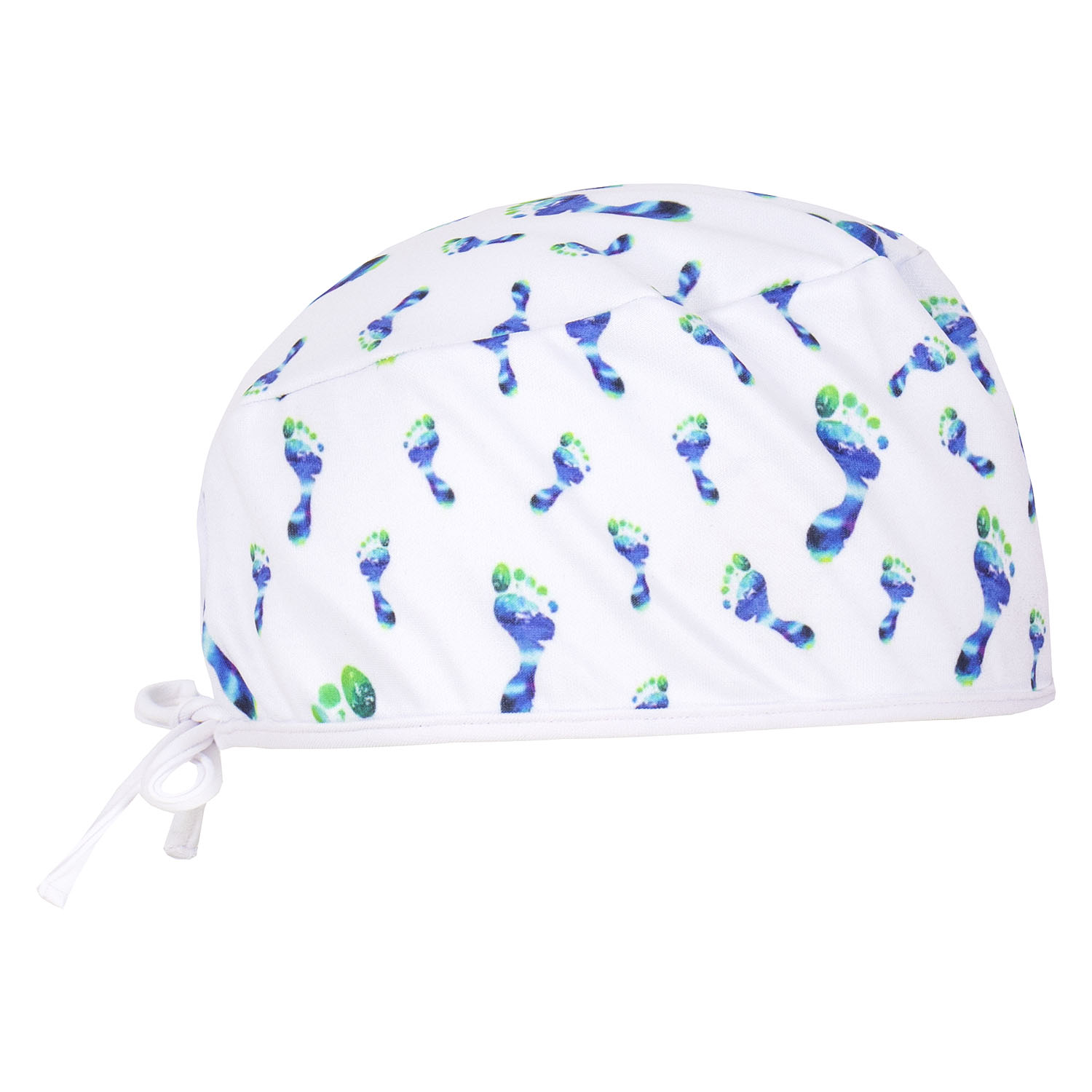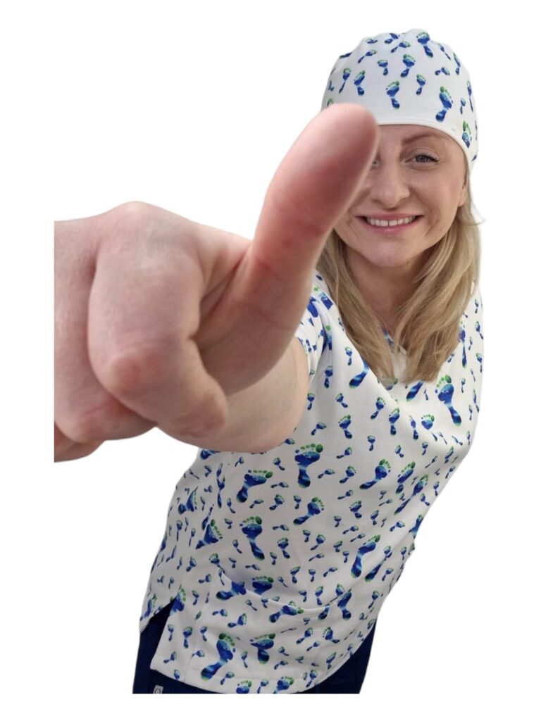 Kolorowy czepek medyczny Happy Feet to obowiązkowy element stroju ortopedów, rehabilitantów, fizjoterapeutów, podologów, refleksologów, pedicurzystów oraz innych osób zajmujących się zdrowiem i pielęgnacją stóp.