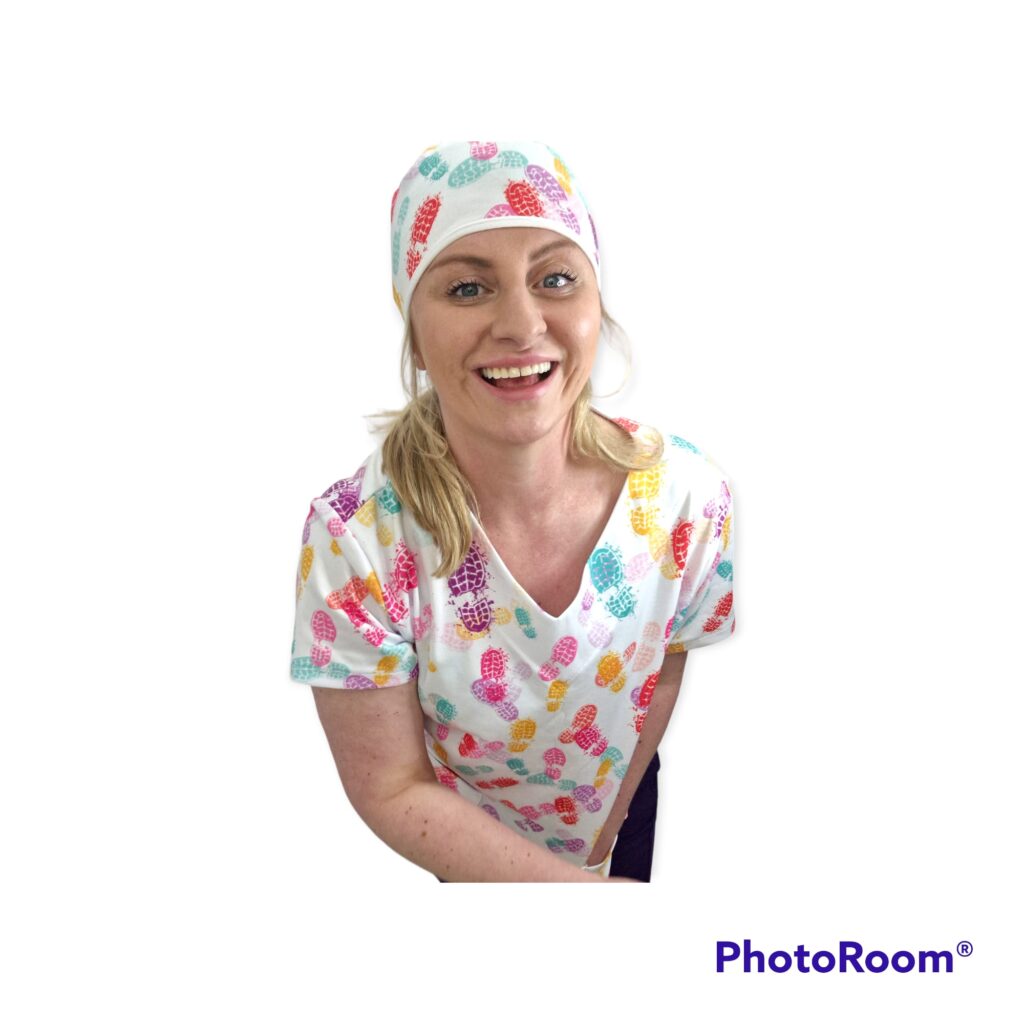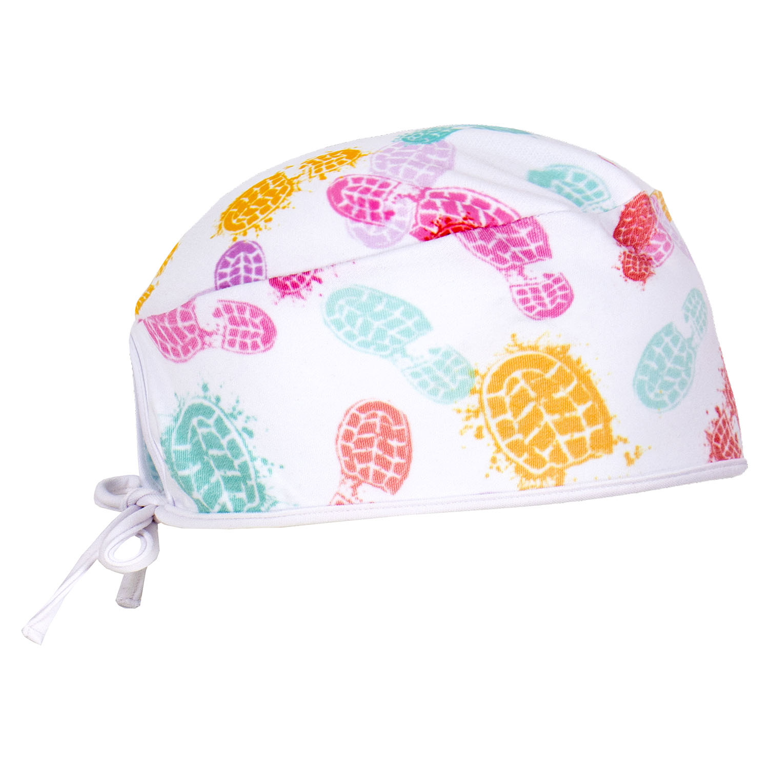 Specjalistyczny, kolorowy czepek medyczny w artystyczne wzory prezentujące odciski butów. Dzięki oryginalnemu printowi przełamiesz sztywne standardy w gabinecie zabiegowym oraz zwiększysz zaufanie wśród pacjentów. Czepek o uniwersalnym rozmiarze wykonano z oddychającego i rozciągliwego materiału z certyfikatem bezpieczeństwa OekoTex standard 100.